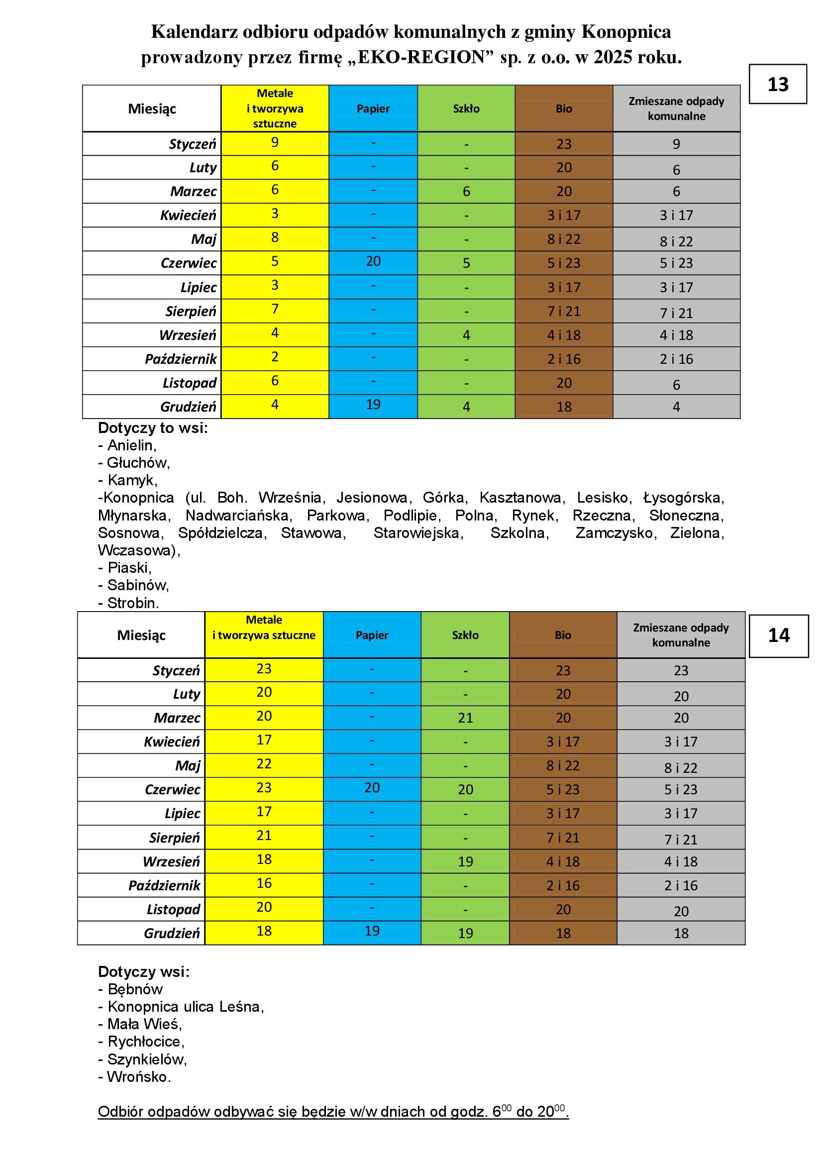 EKO-REGION sp. z o. o. uprzejmie informuje, że w dniach od 19.05.2025 r. do 23.05.2025 r. od godziny 6.00 na terenie Gminy odbędzie się bezpłatny odbiór odpadów wielkogabarytowych od wszystkich właścicieli prywatnych posesji. Odpady będą zbierane w trakcie przejazdu samochodu przez każdą miejscowość danego sołectwa według następującego harmonogramu: